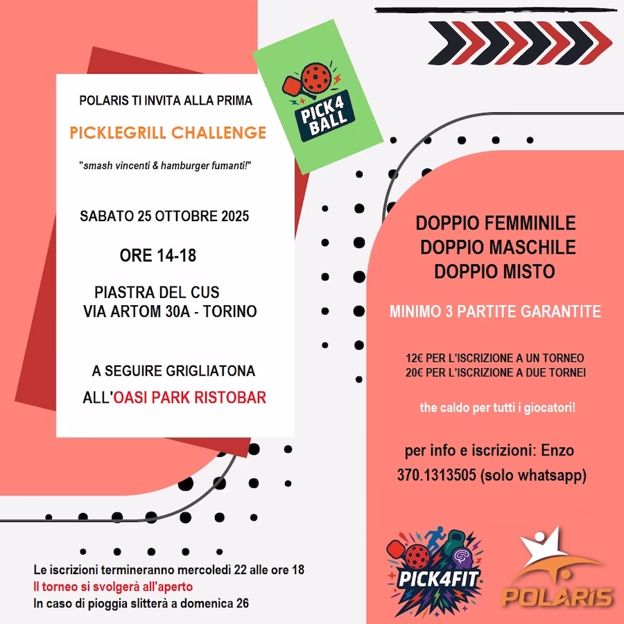Polaris organizza il Picklegrill Challenge a Torino, torneo di pickleball seguito da grigliata. Sabato 25 ottobre 2025, dalle 14 alle 18 ci saranno doppi femminili, maschili e misti con minimo 3 partite garantite. A seguire grigliata. Via Artom 30A, Torino. Le iscrizioni termineranno mercoledì 22 alle ore 18 (12 euro iscrizione ad una categoria, 20 euro per due categorie). Il torneo si svolgerà all’aperto e in caso di pioggia slitterà a domenica 26. Per informazioni e iscrizioni: Enzo 370 1313505 (solo whatsapp).